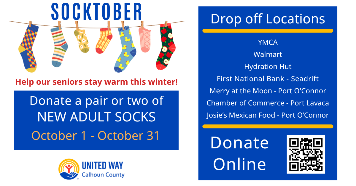 In an effort to warm the hearts and feet of local senior citizens once again this winter, United Way of Calhoun County will hold its fifth annual Socks for Seniors sock drive! Drop boxes will be located throughout Calhoun County for your convenience through October 31st. If you prefer we do the shopping for you, you may make donations through our online portal. At the close of the drive, all monetary donations will be used to purchase socks at our local Walmart which will be included with the distribution.